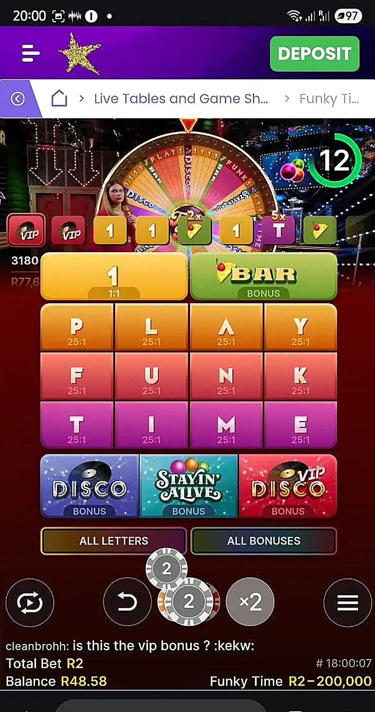 Después de cada ronda, puedes abrir el panel de funky time stats para ver tus últimas tiradas, los bonus activados y los multiplicadores alcanzados. De esta manera, resulta más sencillo decidir si quieres centrarte en el número 1, apostar fuerte a letras concretas o reservar saldo para cazar un funky time bonus concreto como VIP Disco.